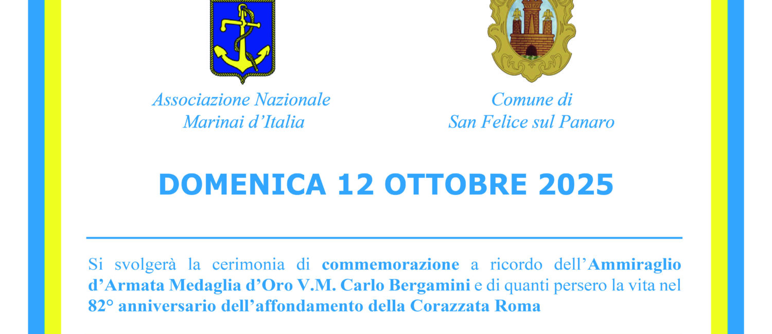 Domenica 12 ottobre a San Felice sul Panaro si svolgerà la cerimonia di commemorazione dell’ammiraglio d’armata medaglia d’oro Carlo Bergamini e di quanti persero la vita nella ricorrenza dell’82° anniversario dell’affondamento della corazzata Roma.